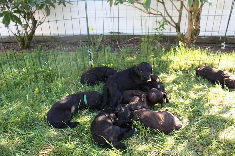 Fortsatt så har vi det godt og varmt på vestlandet og selv om valpene har lagt ute i skyggen i hele dag, så har de vært gode og varme. De er ikke begynt å drikke noe vann enda, så eneste fuktighet de får i seg er det de får vie morsmelken og den som jeg har oppi når jeg blander maten til de. Stort sett så har de lagt og sovet i hele dag.